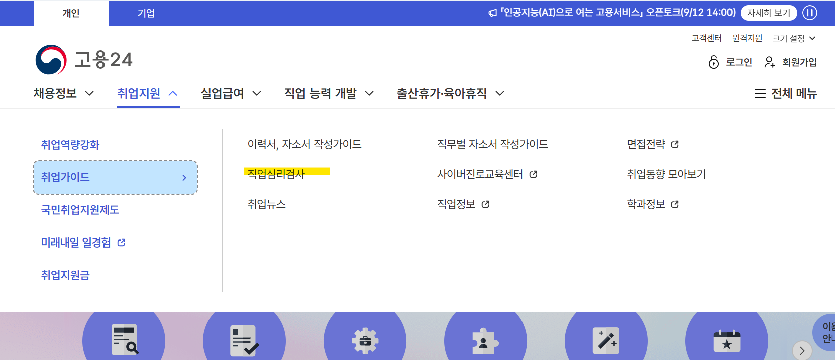 - [취업가이드] → [직업심리검사] 선택